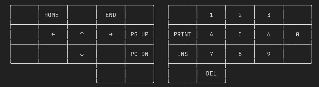 Holding down Space (on the left half) activates the navigation pad on the left, and the number pad on the right. It also enables Backspace to act as Delete.